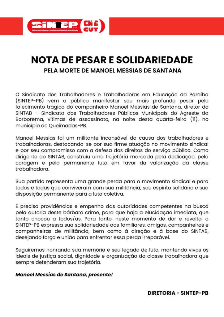O Sintep-PB divulgou uma nota de pesar e solidariedade pelo falecimento trágico do companheiro Manoel Messias de Santana, diretor do SINTAB – Sindicato dos Trabalhadores Públicos Municipais do Agreste da Borborema, vítima de assassinato na noite desta quarta-feira (11), no município de Queimadas-PB.